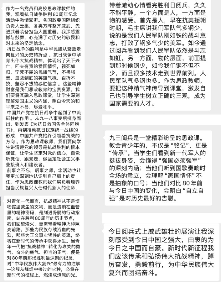 长安街上,军乐声中,受阅部队集结准备,战士们身如青松挺拔,战车如钢铁长城列阵,这是一次捍卫历史的纪念,是一次振奋精神的盛典,是一次传承荣光的行进,更是一次面向未来的启程。此次观看纪念中国人民抗日战争暨世界反法西斯战争胜利80周年大会直播,激起了教师们的自豪感,激发了教师们的奋斗力,引发了教师们的热议。老师们纷纷表示此次纪念中国人民抗日战争暨世界反法西斯战争胜利80周年大会让人倍感震撼与自豪,也更加深刻地感受到作为一名思政教师肩上沉甸甸的责任,在今后的教学工作中将始终牢记立德树人根本任务,为培养实现中华民族伟大复兴的建设者和接班人做出自己的贡献。