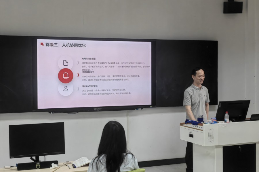 数字赋能:AI助力思政课革新。经理助理王相东现场演示数字化教学工具应用:智能备课-基于“匠帮AI”生成人机协同教案;场景创新-运用“腾讯智影”打造虚拟教学助手;资源提质-通过“通义万相”智能设计教学图谱。学院计划开展“AI+思政”专题培训,推动数字技术深度融入教学全流程。