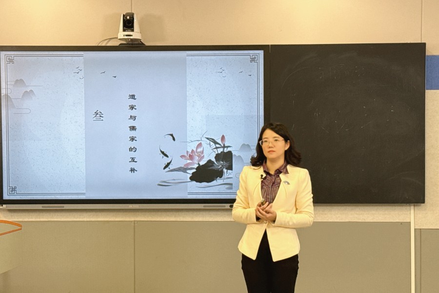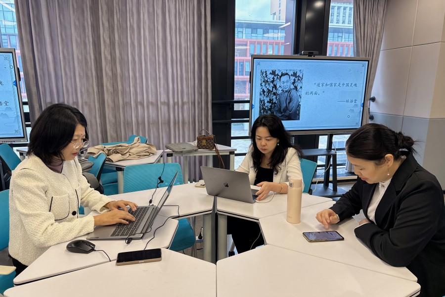 一人讲课,其他人进行观摩,根据现场情况及时对自己的课件进行修改。在休息的空隙,老师们也就讲课过程中出现的问题进行探讨,并充分听取摄影师的建议,现场修正。从教态到眼神的运用,从语速到教学节奏的把握,从语气到个人风格,以及教学内容的进一步优化和拓展,在整个过程中,老师们既是建议者也是被建议者,互学互鉴,即时实践,挑战自我,快速提高。陈霓老师“明德新民”儒家有为和“守静致虚”道家无为互补的哲思,韵味悠长;刘宏娇老师中国古代小说《红楼梦》的解读让现场的摄影师也为之赞叹;许敏云老师“流丽万有,东方意境”吟咏中国诗词文化;沈玉华老师以美育人、文治教化,雅人深致。截至17时50分,本次活动顺利完成训练任务,达成任务目标。
