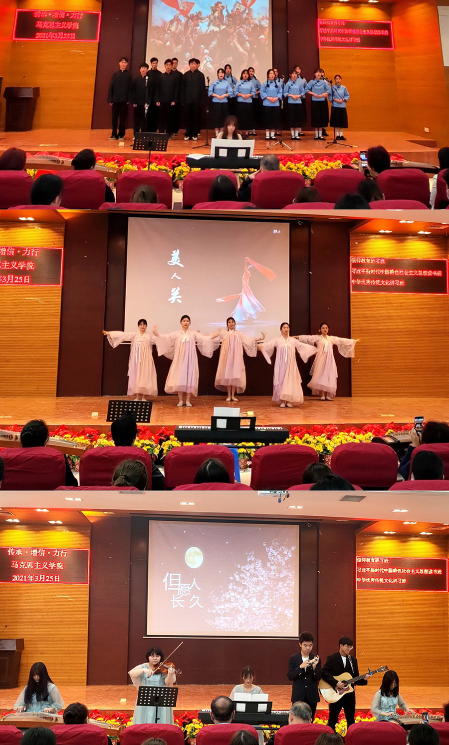 博雅吟唱团表演了《美人关》《映山红》《但愿人长久》等精彩节目,带领大家穿越时光,感受了传承的力量。学员们纷纷表示收获良多,明确了自己的学习目标和任务,以昂扬姿态和优异成绩迎接建党一百周年。