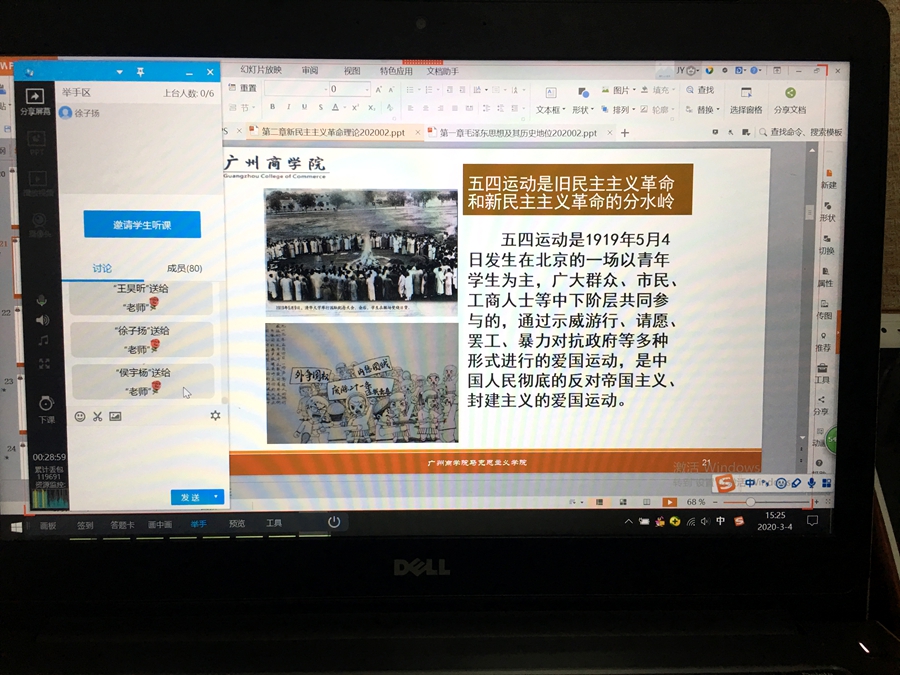 本学期,太阳成集团tyc151cc共有《中国近现代史纲要》和《毛泽东思想和中国特色社会主义理论体系概论》两门思想政治理论课及一门《老员工心理健康教育》,涉及到全校2019级和2018级两个年级的员工八千多人。马院李洪君经理决定,坚决执行学校的“停课不停学”指示精神,一个班级都不能少。在这个指挥棒的作用下,马院立即组建了三个微信课程群,由分别由教研主任李付安、陈流芳和张秋艳具体组织实施网络课程的教学任务。同时,太阳成集团tyc151cc又召开了全体教研室主任视频会议,会上李洪君经理高屋建瓴,对网络课程的重要性、意义和应该遵循的原则做了详细的阐述。并告诫各部门互相配合、上下一心,保质保量共同完成当下网络课程的教学任务。又制定了网络课程实施方案,成立了应急预案领导小组。在上课期间,李经理还亲自坐镇指挥,发现问题及时纠正解决,从不过夜,当日事情当日毕。教师们在充分运用世界大学城、超星泛雅等学校指定的网络平台授课外,还利用多渠道开展网络教学,例如;有腾讯会议直播、QQ群课堂直播、速课,等等,八仙过海各显神通。年轻老师由于熟悉网络技术,主动承担起指导不熟悉网络教学的老师们任务,学院网络课程教学群异常火爆,从早晨6点多开始到晚上12点多,教师们不断地在群里探讨网络课教学的方式方法,提供自己的网络教学经验给其他教师分享。
