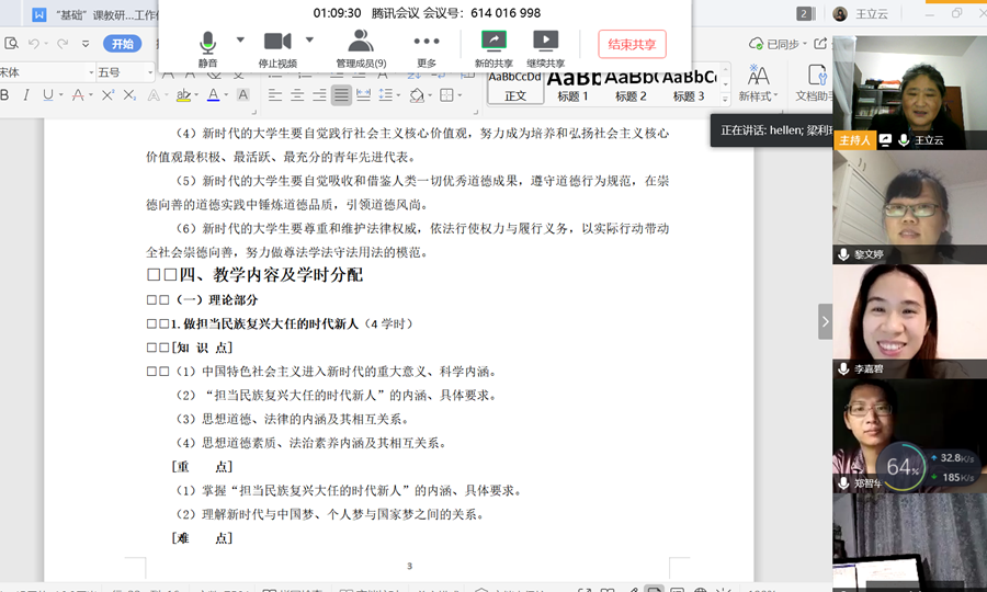 2020年3月28日,“基础课”教研室利用腾讯会议软件进行了2020年第二次视频工作会议。本次会议由教研室主任王立云主持,教研室全体教师参加了会议。
