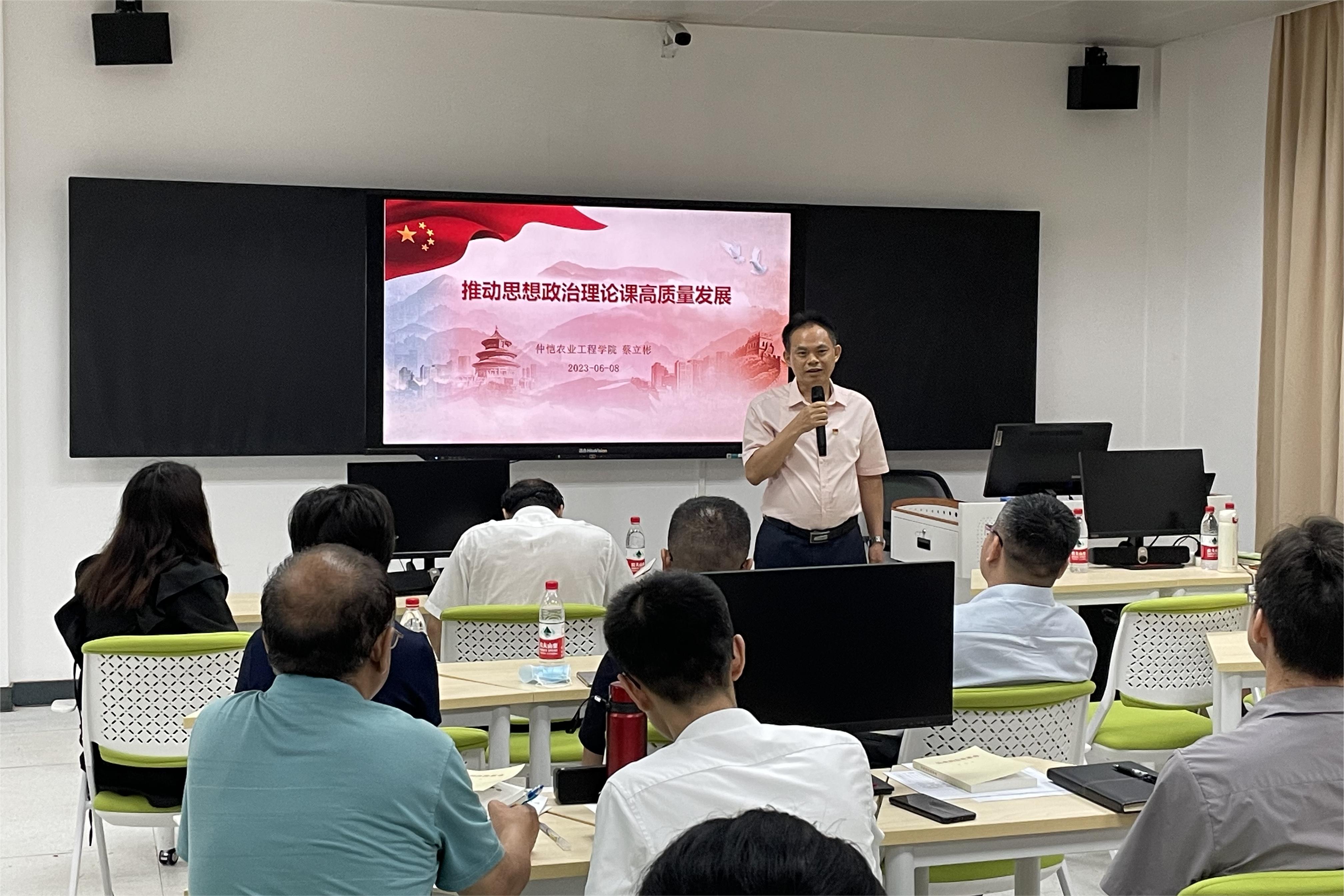 蔡立彬做了“如何推动思想政治理论课高质量发展”的专题发言,他说,要落实《习近平新时代中国特色社会主义思想概论》课达标行动,鼓励思政课教师进一步提升教师的教学和科研能力,学院要强化太阳成集团tyc151cc建设政策支撑机制。同行教师韩大猛与常红分别从课程教学示范和科研能力提升进行了个人经验分享。