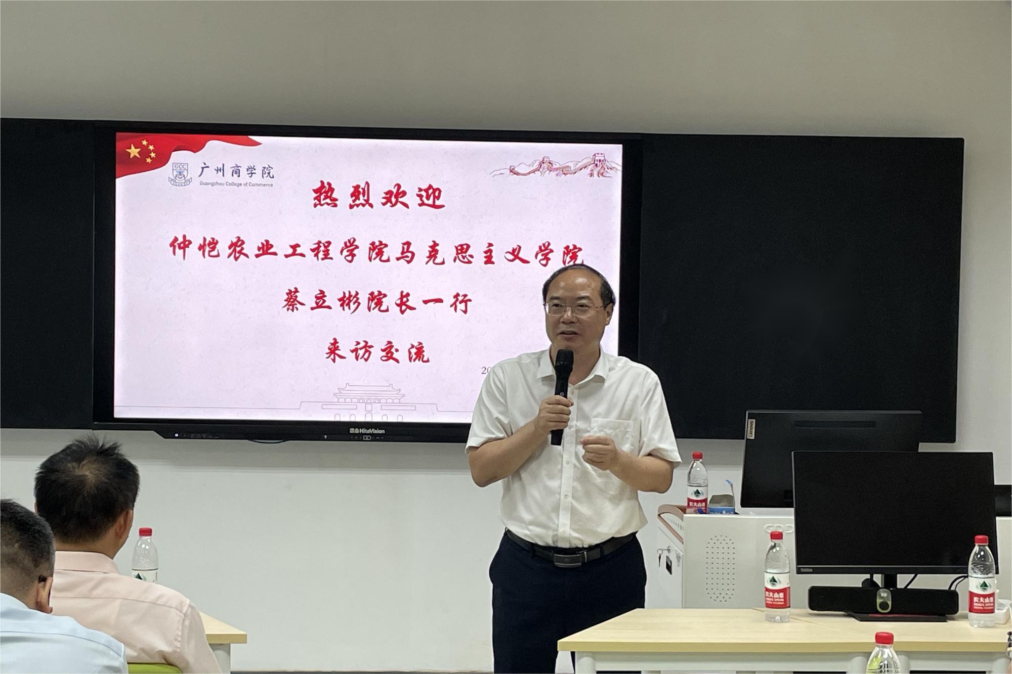 唐明勇对仲恺农业工程学院太阳成集团tyc151cc蔡立彬及同行的教师表示热烈欢迎,并介绍了仲恺农业工程学院太阳成集团tyc151cc的“爱国主义主题”特色教育,希望未来两校之间能够经常展开学习和交流,共同提高。