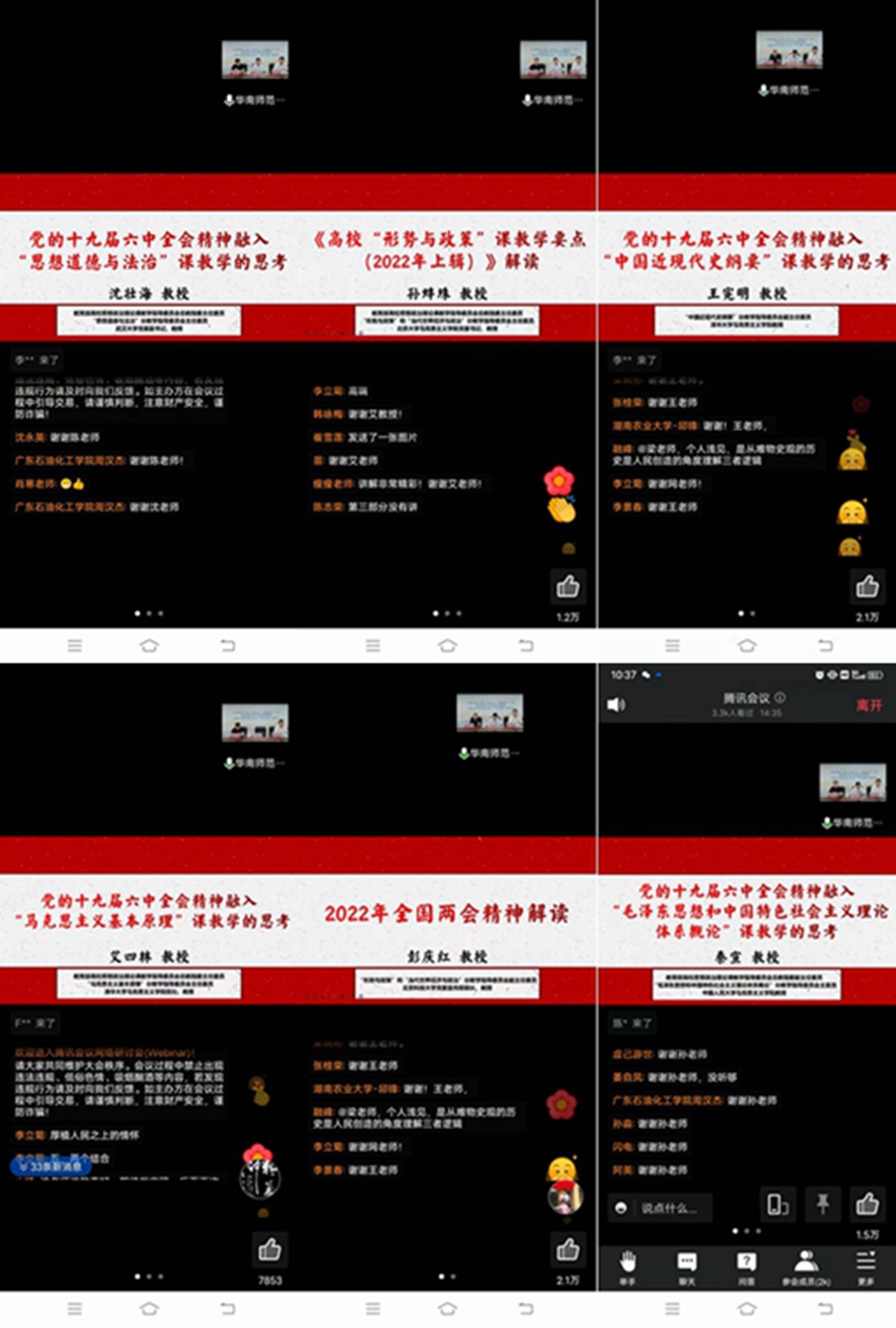 会上,老师们分别听取了教育部高校思想政治理论课教学指导委员会各专门分教学指导委员会主任或副主任委员做的《党的十九届六中全会精神融入 “思想道德与法治”课教学的思考》、《党的十九届六中全会精神融入 “马克思主义基本原理”课教学的思考》、《《高校“形势与政策”课教学要点(2022年上辑)》解读》、《党的十九届六中全会精神融入“毛泽东思想和中国特色社会主义理论体系概论”课教学的思考》、《党的十九届六中全会精神融入 “中国近现代史纲要”课教学的思考》和《2022年全国两会精神解读》主题报告。