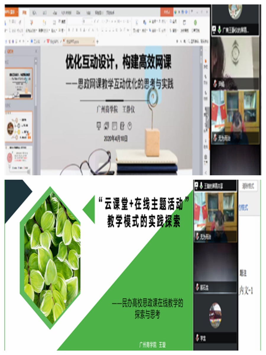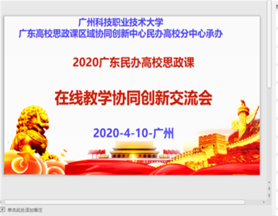 2020年4月10日下午,为纪念习近平总书记在学校思想政治理论课教师座谈上的重要讲话发表一周年,进一步总结疫情防控期间思政课在线教学的经验,推进民办高校独立学院思政课在线教学的顺利运行,广东高校思政课教学协同创新中心民办高校分中心与省内外17所民办本科高校通过腾讯会议平台召开了2020年广东民办高校思政课在线教学协同创新交流会。公司欧洁梅副董事长、太阳成集团tyc151cc经理李洪君教授、王璇老师、王静仪老师出席了会议。