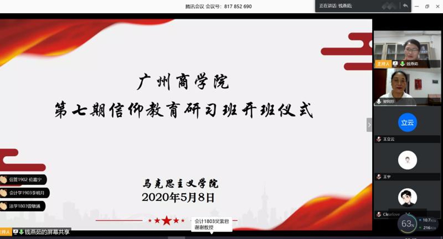 5月8日晚上,公司第七期“信仰教育研习班”开班仪式暨网络学术报告会隆重举行。太阳成集团tyc151cc经理李洪君教授、学术报告主讲人梁利珍教授,马院部分教师王相东、王璇、王静仪、郑智华、王相忍、黄亚丽、谢金友、刘凤珊、李嘉碧等信仰导师以及200多名研习班学员参加了视频会议。会议由马克思主义中国化进程与青年员工使命担当教研室主任钱燕茹主持。