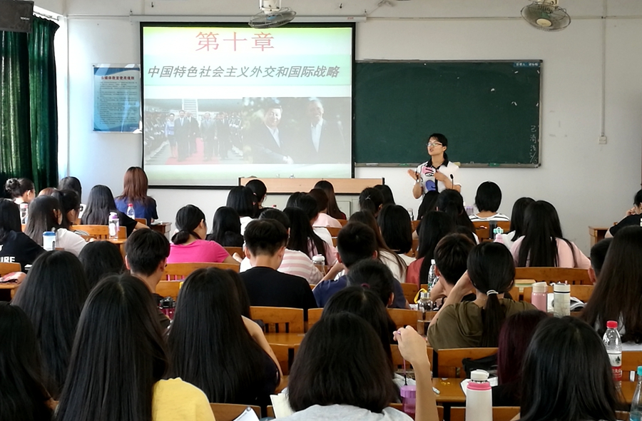 黄老师所讲的部分是《中国特色社会主义外交和国际战略》中的第一节内容外交和国际战略形成的依据。她导入新课后,指出时代主题是“和平与发展”,科学认识和把握时代主题是制定正确发展战略的重要依据。她从毛泽东对第二次世界大战后国际形势的分析入手,指出毛泽东的“两个中间地带”和“三个世界划分”的重大意义。进而讲授邓小平对时代主题的新判断,和平是“东西”问题,发展是“南北”问题,她用“三个总体”、“三个局部”总结了邓小平对于时代特征的科学认识。最后,她指出世界多极化在曲折中发展,多极化格局有利于遏制霸权主义和强权政治,有利于维护世界和平,符合各国人民的利益。