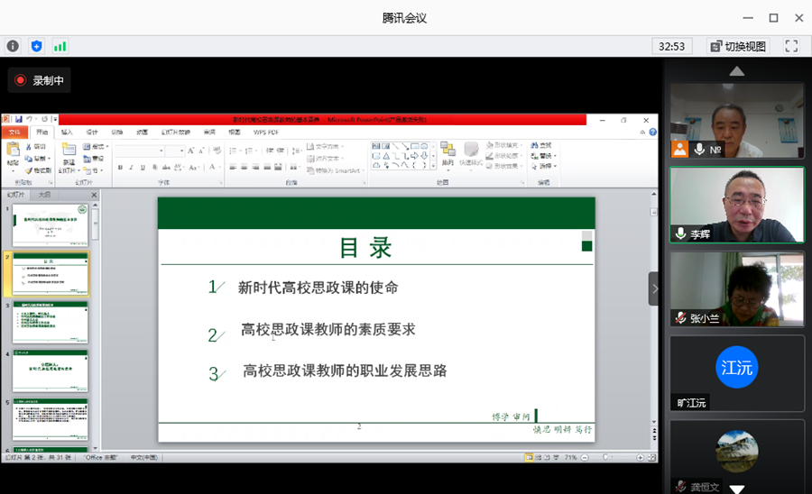 李辉教授从三个方面论述了新时代高校教师的基本素养问题。一是,高校思政教师的使命是什么?二是,高校思政教师的素质要求;三是,高校思政教师的职业发展思路。讲座结束后,老师们一直表示,虽然期末事情很多,但是听了这个报告收获是非常大的,它使教师们从理论学养的高度进一步认清了自己肩上的责任与义务,认清了思政教师应该具备的基本素养。这些对于即将放假的教师来说,如久旱逢甘露,教师们会利用假期这段时间反思教授的教诲,为下学期走向工作岗位,起到加油助力的作用。更为评估工作,教师们搞好教学环节起到良好的推动作用。