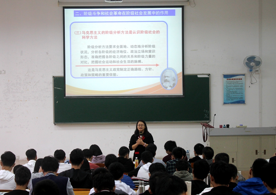 黄亚丽老师主要讲授《马克思主义基本原理概论》课的“马克思主义的阶级分析方法是认识阶级社会的科学方法”、“社会革命的实质和作用”、“改革在社会发展中的作用”三个方面的内容。她通过课前布置的作业讨论引申到本次课堂教学内容,使用历史人物事件与员工讨论的方式让员工结合教学内容展开思考,更加有利于员工深刻地把握教材知识点,并引导员工坚持科学方法评价历史人物。她与员工充分互动,使课堂气氛活跃,带动员工深度融入课堂。