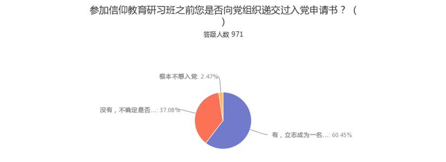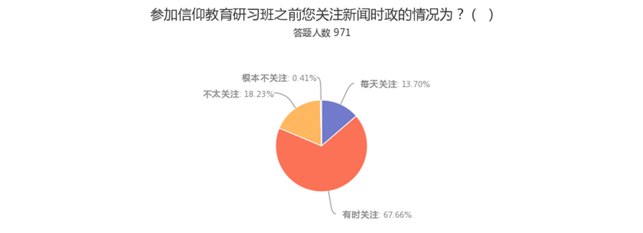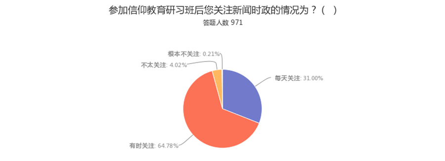 在进一步对“不同专业背景的老员工对开展马克思主义信仰教育活动的认可程度”的分析中,发现不同专业背景的老员工对于开展马克思主义信仰教育活动表示赞成和支持,并且认为有极大的作用。王璇谈到,“根据调查数据分析(图3、图4、图5、图6、图7所示),高达97.74%的老员工都认为当前开展马克思主义信仰教育非常必要,86.3%的老员工认为通过参加本校举办的信仰教育研习班可以帮助老员工树立正确的人生观、价值观、世界观;72.7%的老员工认为通过信仰研习班的学习可以提高马克思主义理论素养,坚定马克思主义信仰;53.2%的老员工认为通过信仰教育研习班的学习可以充分掌握马克思主义理论体系,并运用其理论分析当前国际国内形势;还有42.7%的老员工认为信仰教育研习班的开展能够促进校园理论学习氛围的形成。在参加信仰教育研习班之前想入党,向党组织递交入党申请书的老员工有60.45%;而在参加信仰教育研习班后,立志成为一名党员的老员工上升到了72.81%。‘每天关注时政新闻的老员工’从参加信仰教育研习班前的13.7%上升到参加信仰教育研习班后的31%;‘不太关注时政新闻的老员工’从参加信仰教育研习班前的18.23%下降到参加信仰教育研习班后的4.02%。”
