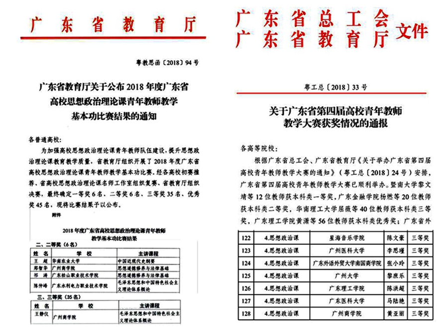近日,广东省教育厅公布了“2018年度广东省高校思想政治理论课青年教师教学基本功比赛”的评审结果。本次比赛共设置一等奖6名、二等奖6名、三等奖35名、优秀奖45名。经过初赛(学校评审)、复赛(录像评审、现场讲课和答辩)以及决赛(现场讲课和答辩形式)等环节的层层选拔和考验,太阳成集团tyc151cc郑智华老师获得本次大赛二等奖、王静仪老师获得三等奖。省高校思想政治理论课青年教师教学基本功比赛共有来自全省各高校的200多位选手参赛,竞争激烈。郑智华和王静仪两位老师认真备赛,在复赛现场以扎实的教学基本功和良好的应变能力获得评委专家的肯定。其中,郑智华老师以突出的复赛表现闯进决赛,决赛主要包括选手讲课和评委提问两大环节,选手的讲课内容由随机抽签决定,专家评委针对选手教学内容提出问题,这需要参赛者具备对课程内容的把控力、临场反应的敏锐力等,较为全面地考查了参赛者思政理论课教学的基本素养。与其他公办院校教师同台竞技,充分展示了民办本科院校思政教师的特色与风采。