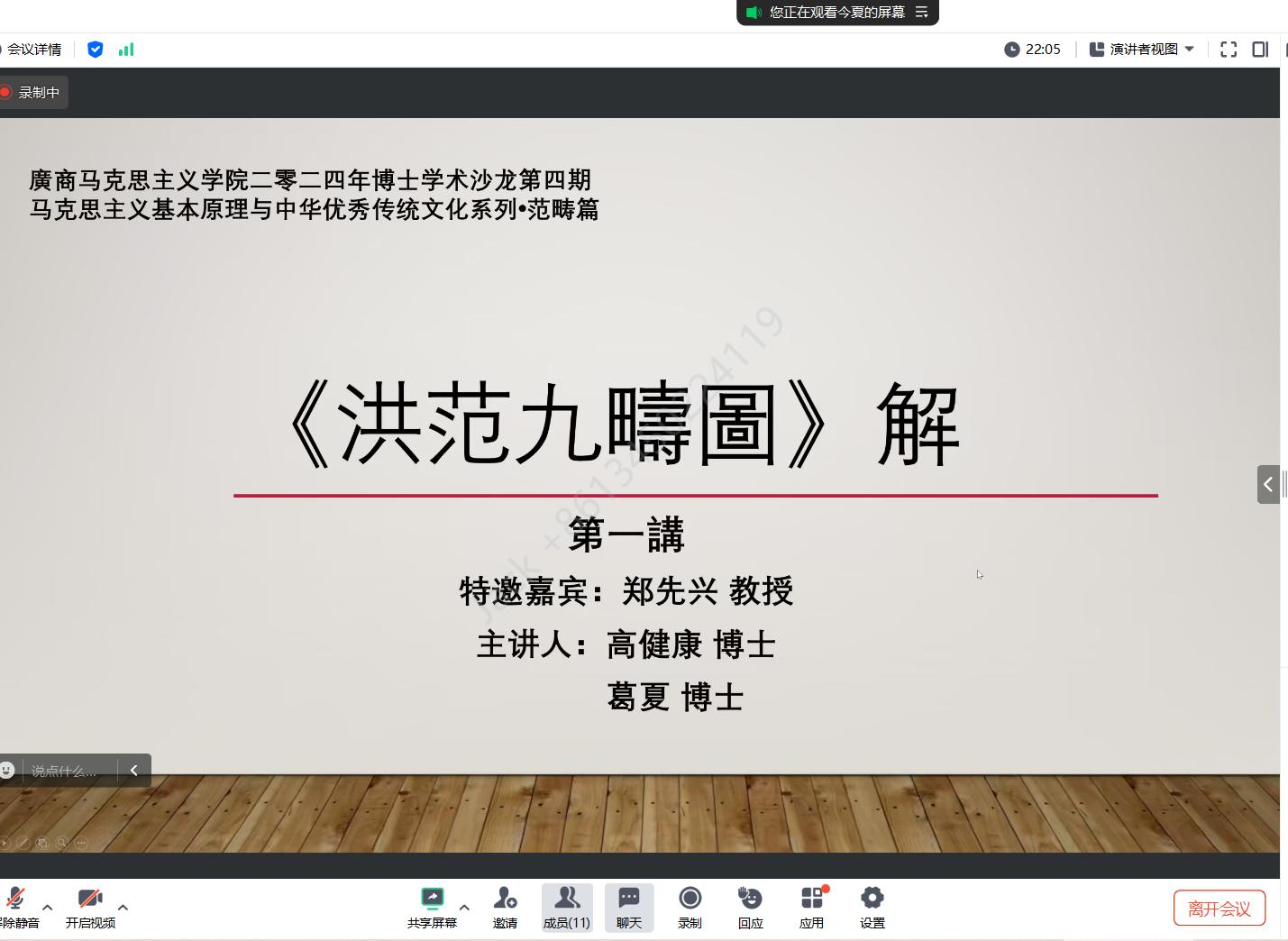 2024年12月12日晚19:30-21:30,太阳成集团tyc151cc通过腾讯会议成功举办了一场主题为“《洪范九畴图》解·第一讲”的博士学术沙龙。本次沙龙由葛夏和高健康博士联合举办,郑先兴教授做了精彩点评和主旨发言,探讨了马克思主义与中华优秀传统文化的结合。