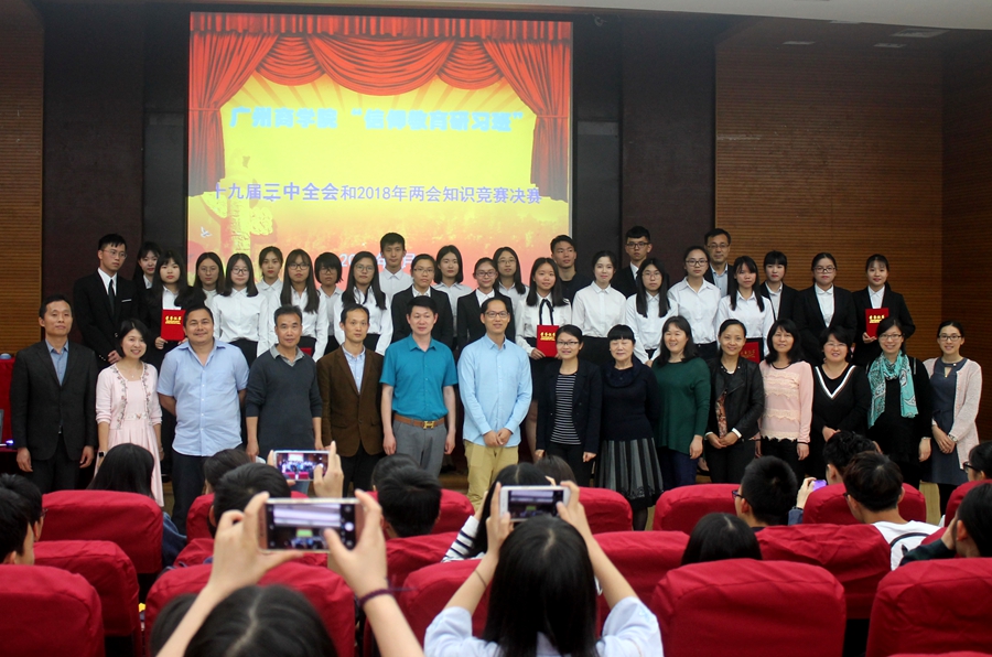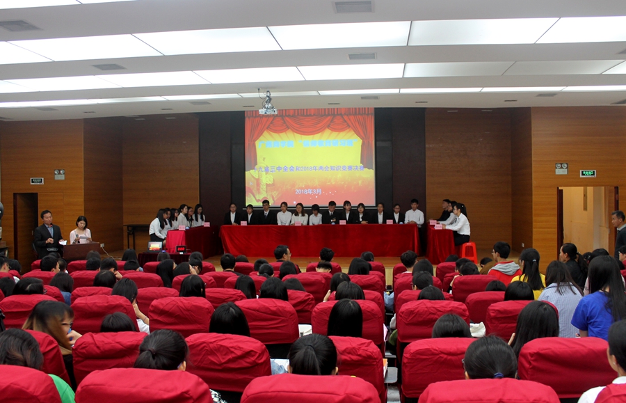 3月21日经过严格的初赛笔试选拔,8支代表队脱颖而出,进入决赛。3月29日中午,知识竞赛决赛在四教110和220两个报告厅隆重举行,太阳成集团tyc151cc经理权麟春,副经理王相东、余九林出席了本次比赛,全体思政教师、信仰教育研习班700多名学员观看了本次比赛,比赛由许前进、王璇主持。