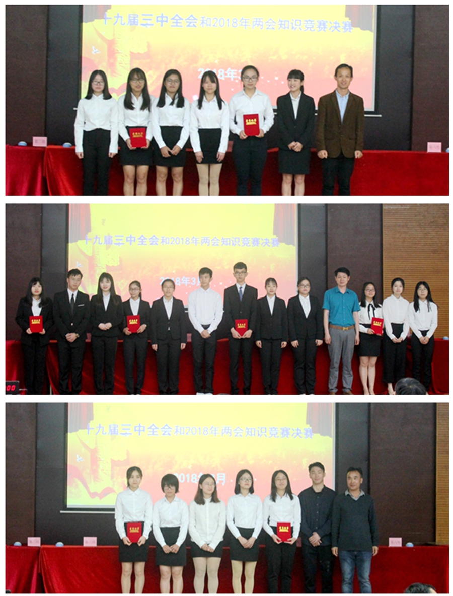 在庄严的国歌声中,决赛正式拉开序幕。本次决赛分为必答和抢答两个环节,主持人介绍比赛规则后,所有选手全身心投入比赛。必答环节,选手们准备充分,胸有成竹,各代表队分数不相上下。抢答环节,选手们全神贯注,争分夺秒,斗志满满,现场气氛既紧张又活跃,观众不时为选手的出色表现欢呼鼓掌。经过激烈的角逐,根据两个环节的最后得分,第一队的林铄姿、徐映珠、陈诗媛与第八队的程媚、雷小云、陈海燕获得一等奖;第二队的吴绮婷、曾楷芬、梁晓棋,第三队的林靖、黄琪琳、许悦,第六队的林锦涛、马丽群、赵志红,第五队的杨少璟、黄金龙、郑文婷均获二等奖;第七队的黄楚婷、李国祥、符琼文,第四队的陈玉萍、黄芷萱、张小梅均获三等奖。王相东、余九林、陈流芳为获奖团队颁奖。