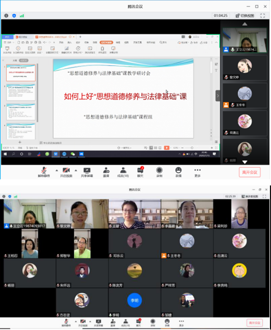 为进一步贯彻落实学校教学工作会议精神和“六位一体、交叉复合”人才培养理念,深化思政课教学改革与研究,以改革促改进,不断提高思政课教学质量,用习近平新时代中国特色社会主义思想铸魂育人,切实发挥思政课立德树人关键课程作用,“基础课”课程组于2020年7月15日晚通过腾讯会议平台召开了题为“如何上好‘思想道德修养与法律基础’课”的教学研讨会,会议由基础课教研室主任王立云主持,担任基础课的全体教师参加。研讨会历时两个小时。