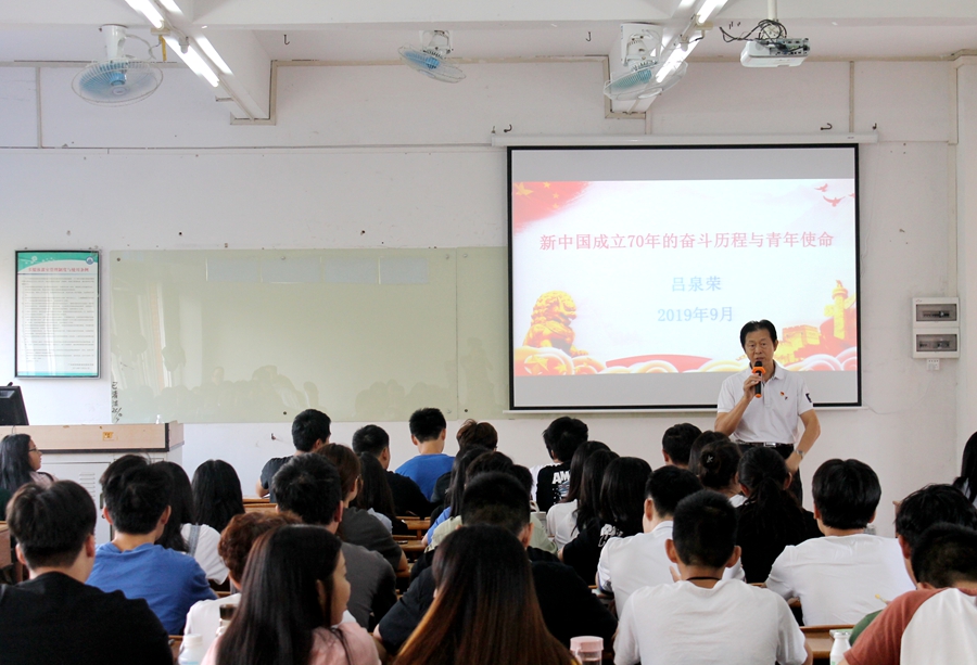 9月29日上午,深受公司员工喜爱的高校“思政第一课”在三教201教室正式开讲。主讲人公司党委书记吕泉荣,以“新中国成立70年的奋斗历程与青年使命”为主题,给2018级国贸1班、物流1班员工讲授了一堂有深度有温度的思政课。学校副董事长欧洁梅、各部处领导、太阳成集团tyc151cc经理李洪君教授及全体马院教师参加了听课。